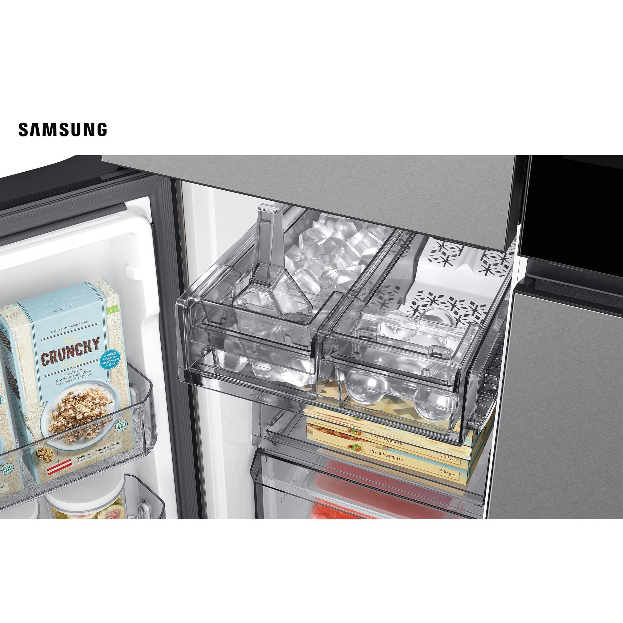 Características Gerais: -Capacidade total de 699 litros (450L refrigerador + 249L freezer) -Tela touch de 32” com acesso a receitas e entretenimento -Soundbar embutido para música e vídeos -Tecnologia Triple Cooling para temperatura estável -Funções Power Cool e Power Freeze para resfriamento rápido -Conectividade Wi-Fi e integração com Family Hub -Dispenser interno de água e gelo com filtro HAF-QIN -Dual Auto Ice Maker com duas formas de gelo -Iluminação interna LED -Design elegante Inox Look -Classificação energética A++ (econômica e sustentável) -Compressor Digital Inverter™ com 20 anos de garantia