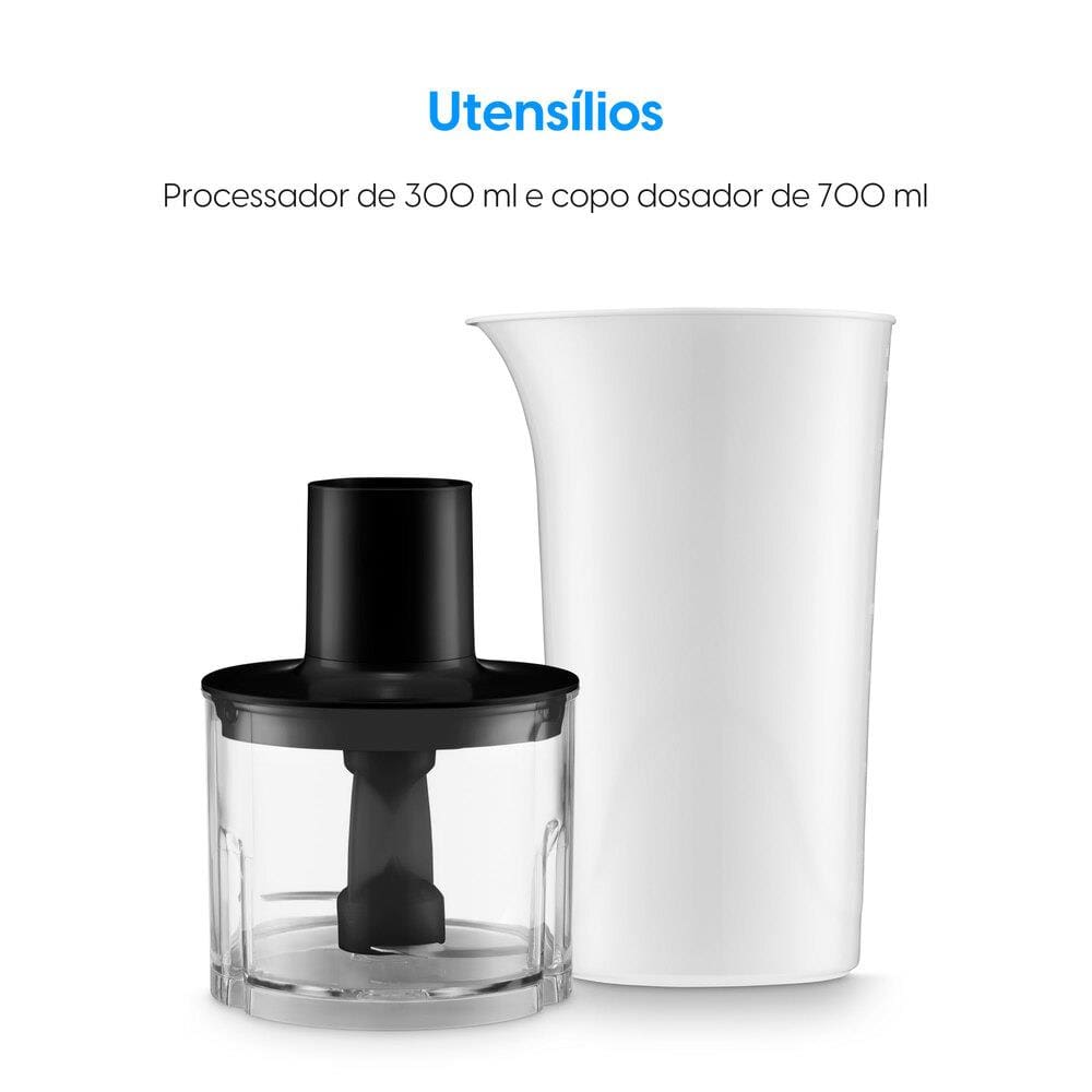 Com 200W de potência, garante alta performance para misturar e triturar alimentos com rapidez. Acompanha copo de 700ml, miniprocessador com capacidade de 300ml e fouet flexível para massas leves.