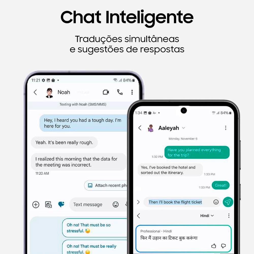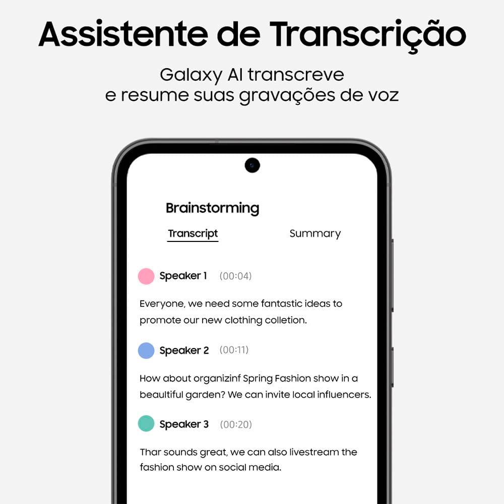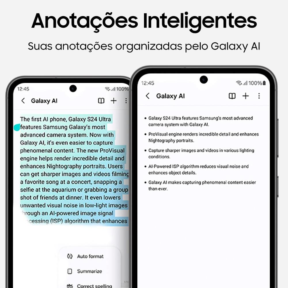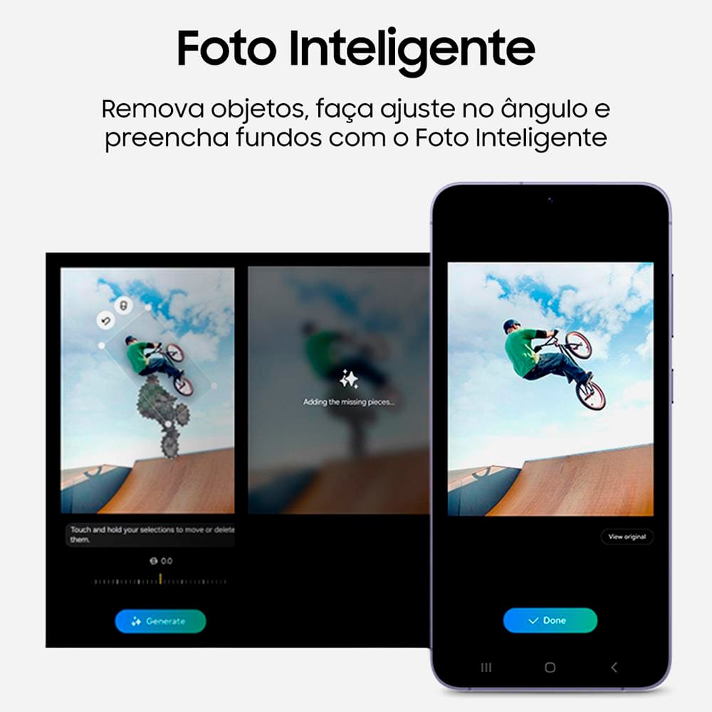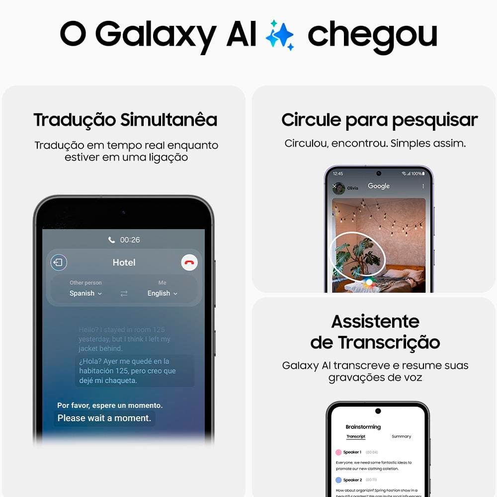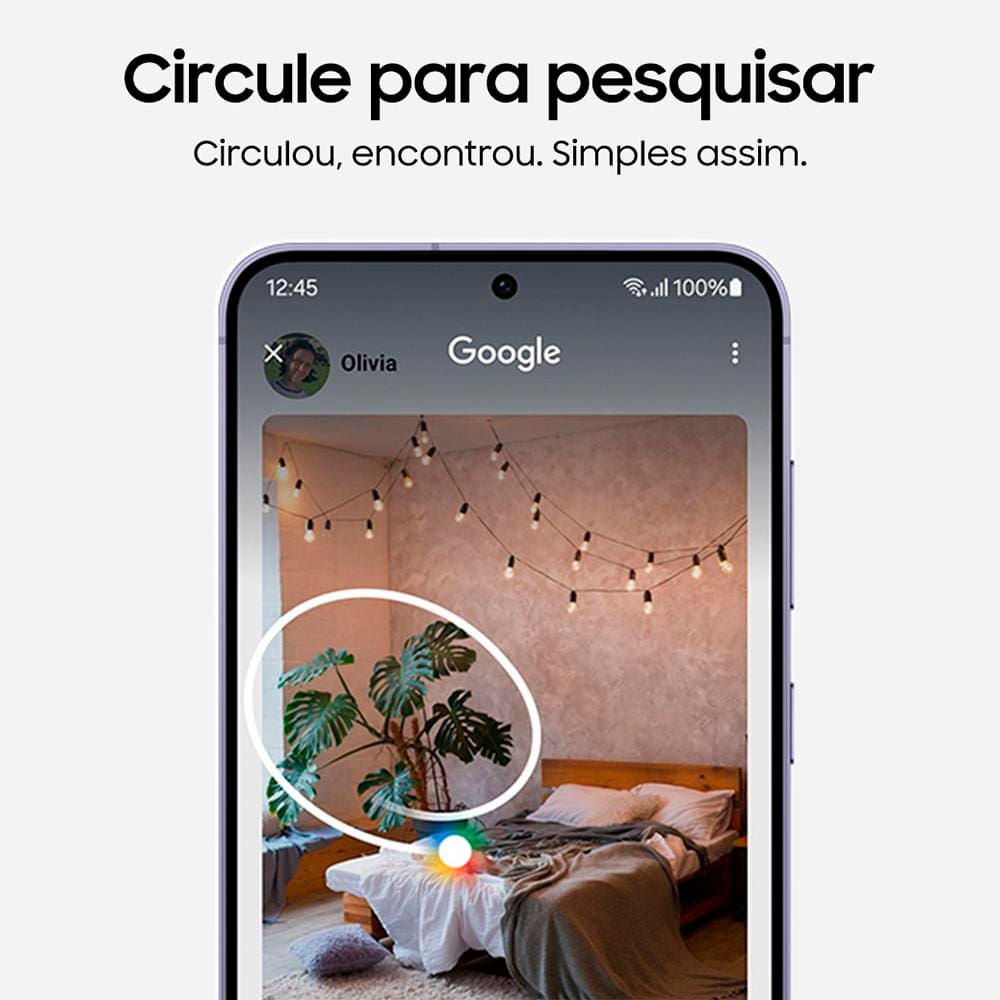Conheça a Galaxy AI, a inteligência artificial do Samsung Galaxy S23 FE. Com os recursos de IA, você poderá fazer tradução em tempo real durante uma ligação ou um chat, obter transcrição de gravações de voz, receber sugestões de respostas e organização anotações. A IA do S23 pode ainda fazer pesquisas a partir de círculos em uma imagem e ajustes em fotos, com os seus recursos de foto inteligente.