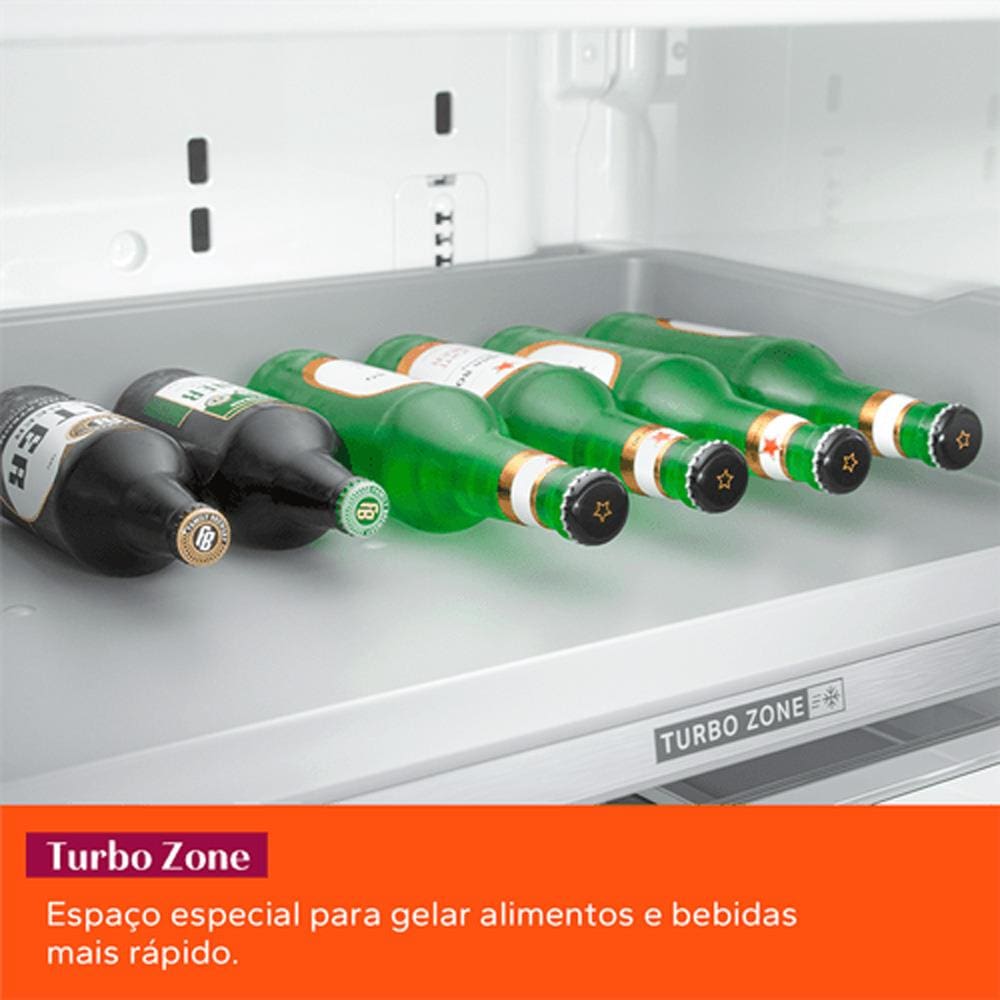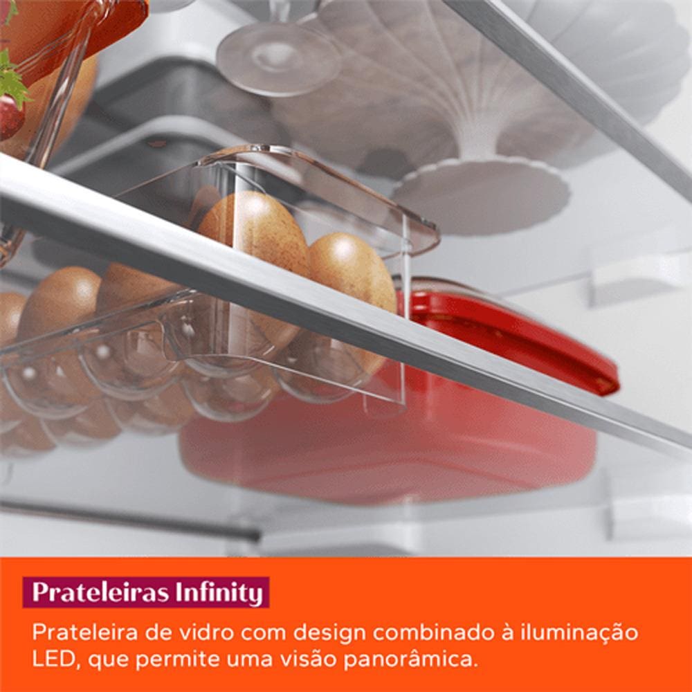 As prateleiras Infinity, feitas de vidro temperado com bordas infinitas, aliadas à iluminação LED, oferecem um design sofisticado e funcional. Elas garantem uma visão panorâmica completa, facilitando o acesso a todos os itens. O painel Touch Black adiciona um toque moderno, permitindo controlar funções essenciais com apenas um toque, enquanto o acabamento premium e os puxadores elegantes tornam essa geladeira uma peça de destaque em qualquer cozinha.