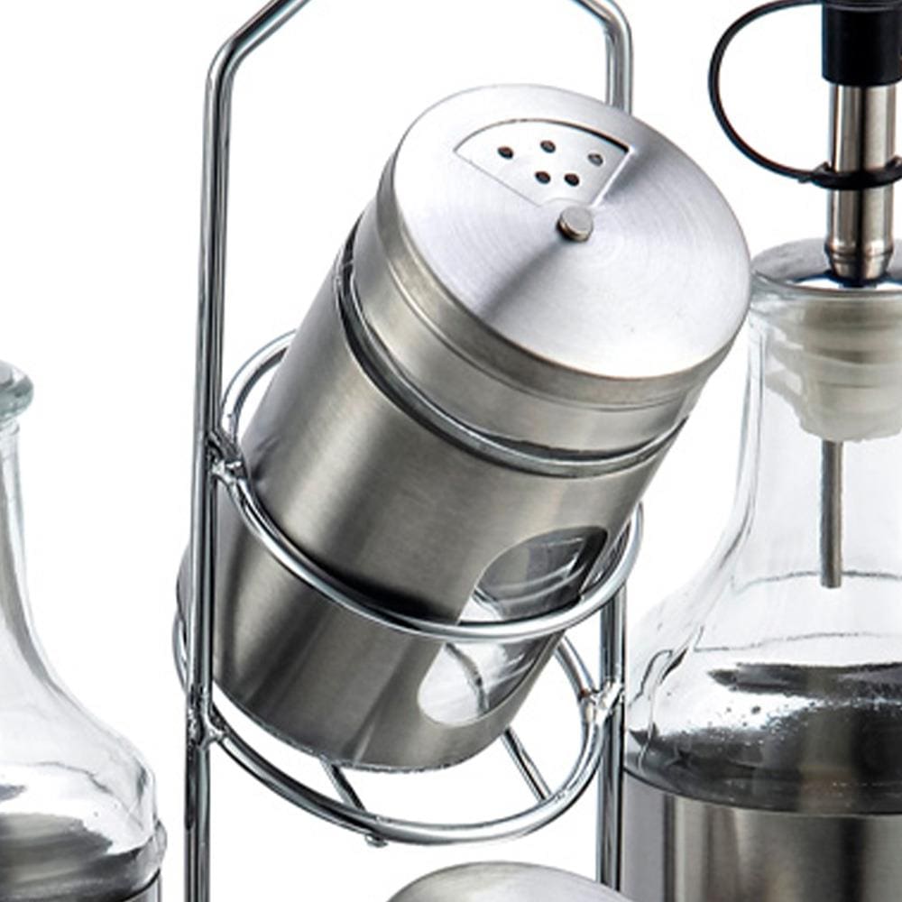 Características Gerais: -Material: aço inoxidável (suporte) e vidro transparente (recipientes); -Dimensões: Galheteiro: 6,5 cm (D) x 22,5 cm (A) – Capacidade: 380 ml; Porta-condimentos: 4,4 cm (D) x 8 cm (A) – Capacidade: 90 ml; Suporte: 21,6 cm (L) x 7,7 cm (P) x 27,3 cm (A); -Composição do Conjunto: 2 galheteiros para azeite e vinagre; 2 porta-condimentos para sal e pimenta; Suporte em aço inox para organização e praticidade.