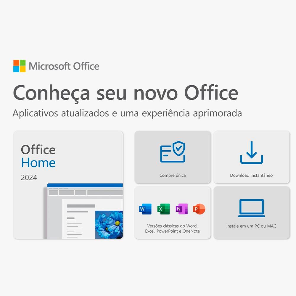 Características gerais: -Essenciais para a produtividade: Office Home 2024; -Versões clássicas para desktop do Word, Excel, PowerPoint e OneNote; -Compra única para 1 PC ou Mac; -Ideal para estudantes, perfeito para uso doméstico ou escolar; -Acesso ao suporte da Microsoft.