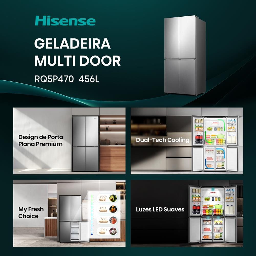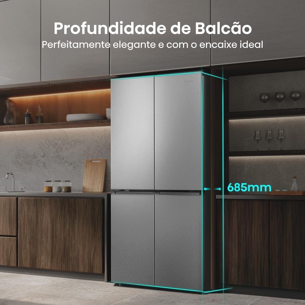 Geladeira Hisense Multi Door Frost Free Inverter RQ5P470. Projetada para integrar-se perfeitamente às cozinhas modernas, que demandam alta capacidade, conectividade inteligência e desempenho.