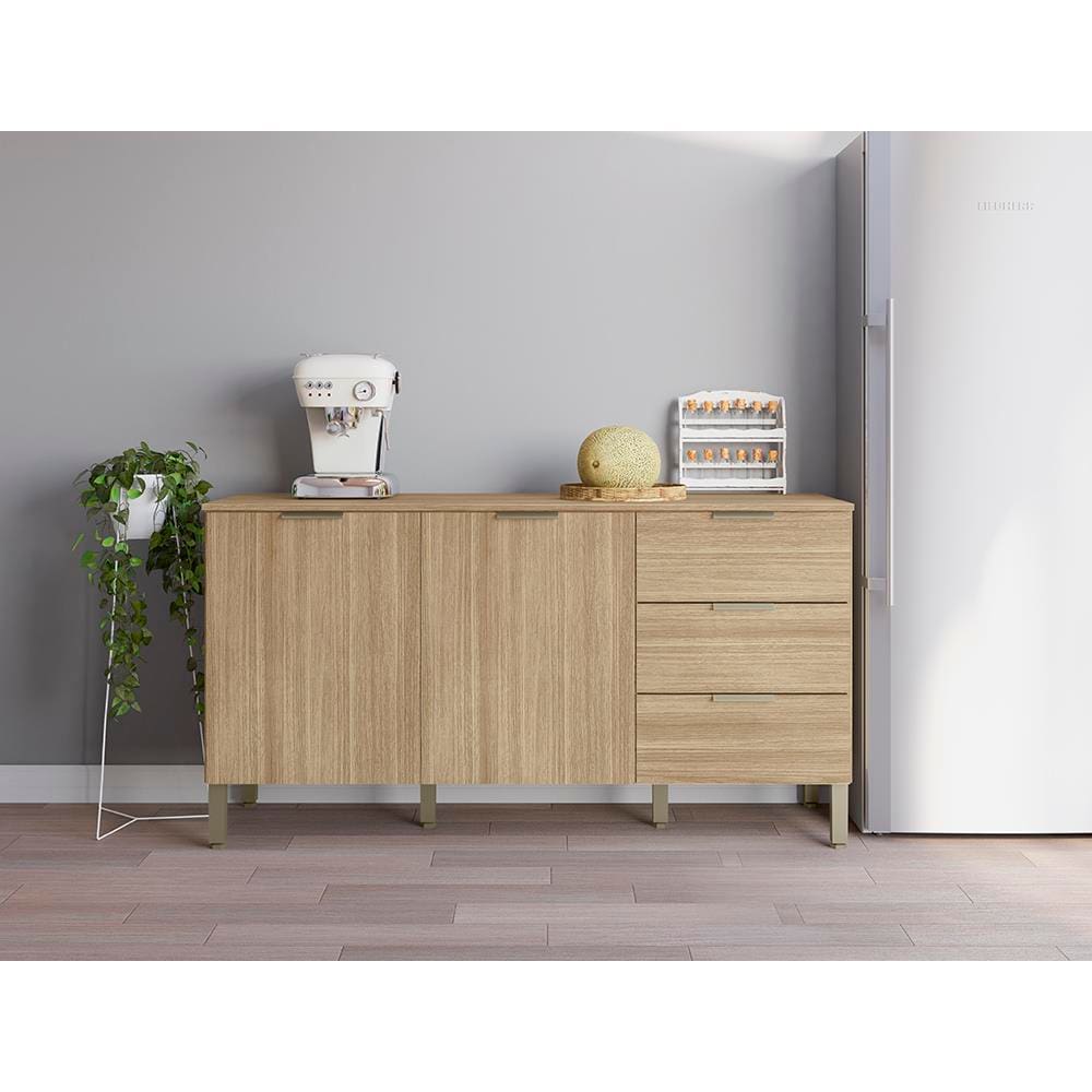 Com 2 portas de bater e 3 gavetas com corrediças telescópicas, ele garante organização e fácil acesso aos utensílios. As corrediças proporcionam deslizamento suave e maior durabilidade, permitindo melhor aproveitamento interno das gavetas com abertura total.