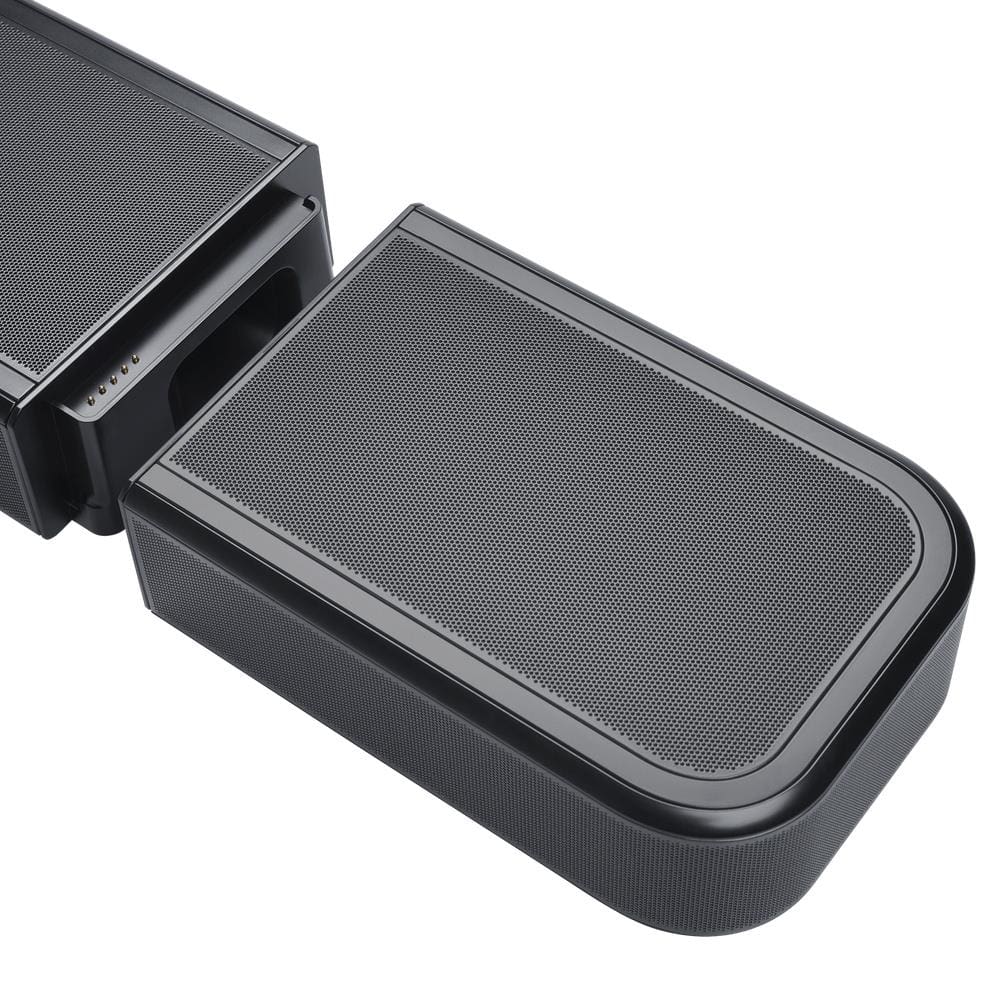 Seu subwoofer sem fio de 12” garante graves potentes e profundos, enquanto as colunas traseiras removíveis permitem criar um verdadeiro som surround sem cabos extras. Basta destacá-las e posicioná-las atrás do ambiente para mergulhar em uma atmosfera cinematográfica.