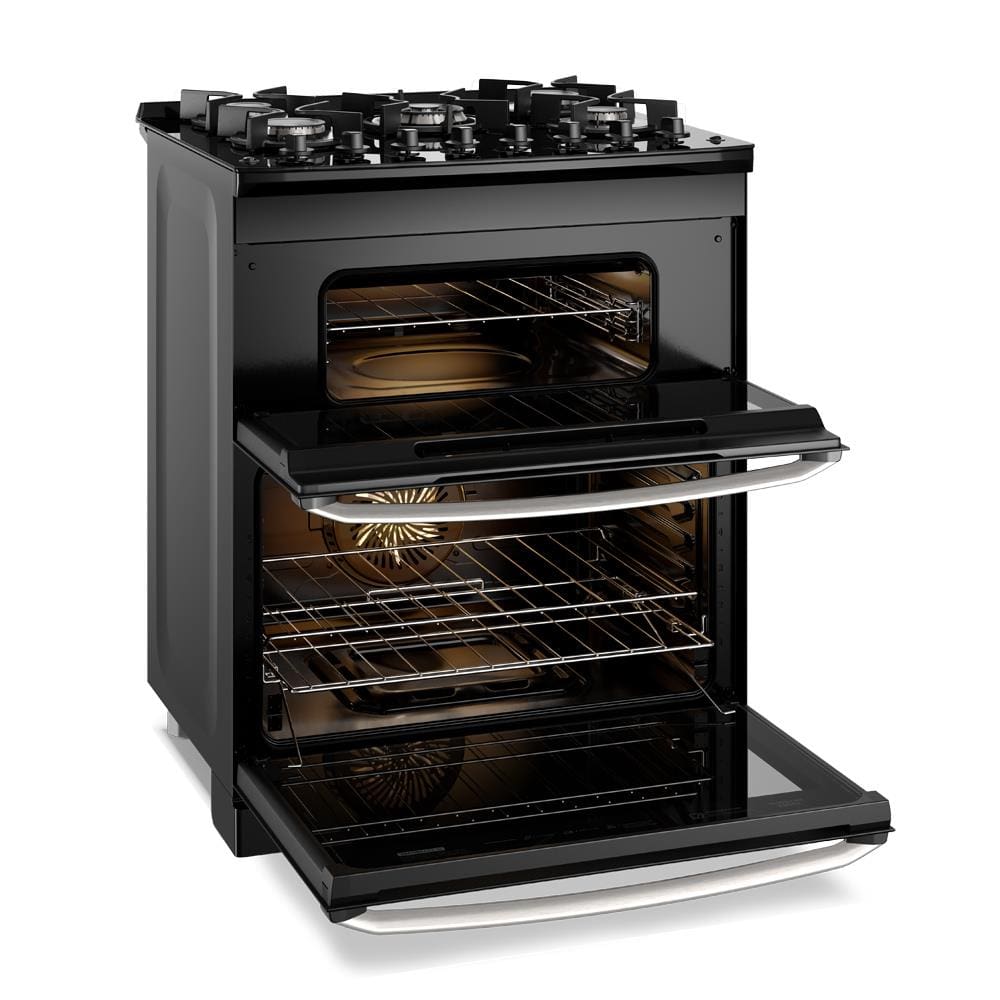 O diferencial está no Forno duplo: forno superior elétrico de 35,1L e forno inferior a gás de 108,9L, permitindo preparar dois pratos simultaneamente sem misturar sabores, com mais praticidade e economia de tempo.
